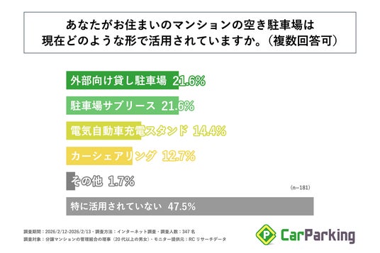 遊休資産を活用した新たな収入源の確保に関心がある分譲マンション管理組合の理事の約半数が、自身のマンションの空き駐車場は「特に活用されていない」と回答
