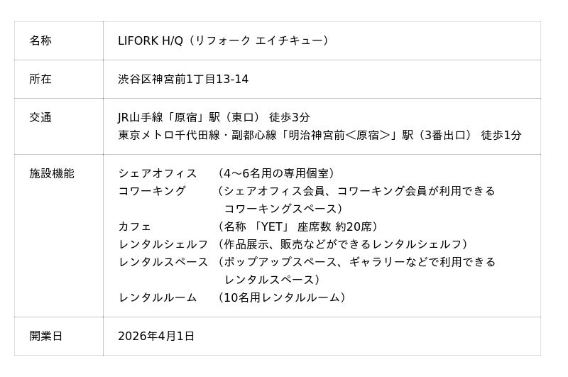 NTT都市開発株式会社(本社:東京都千代田区、代表取締役社長 池田 康)は、自分らしいワーク&ライフスタイルの実現をサポートするシェアスペース事業『LIFORK(リフォーク)』を2018年より展開しています。このたび、原宿クエスト(東京都渋谷区)4階において、2026年4月1日(水)に開業するクリエイター向けシェアオフィス・コワーキングスペース「LIFORK H/Q(リフォークエイチキュー)」(以下「本施設」)内に、同日、カフェ『YET(イエット)』がオープンすることをお知らせします。