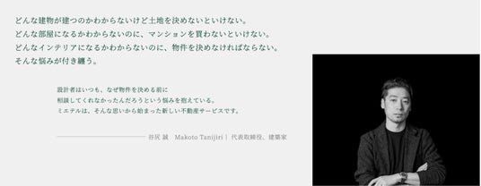 『Mietell』は、「不動産の価値を視覚化する」をコンセプトに建築家 谷尻誠が手がける建築デザインと最新のテクノロジーによる建築CGを融合させた、不動産情報の取扱いを行う革新的な不動産流通プラットフォームです。