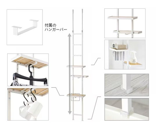 天井と床に突っ張るだけで設置できる両面仕様の省スペース収納ラック。足キャップの面裏を切り替えれば、平らな床、洗濯パンのフチのどちらにも設置可能で、洗面所やランドリールーム、キッチンのすき間収納として活躍。付属のハンガーバーや別売り追加棚・スチールプレートでアレンジ性も高く、空間を無駄なく使えるカインズオリジナル家具です。