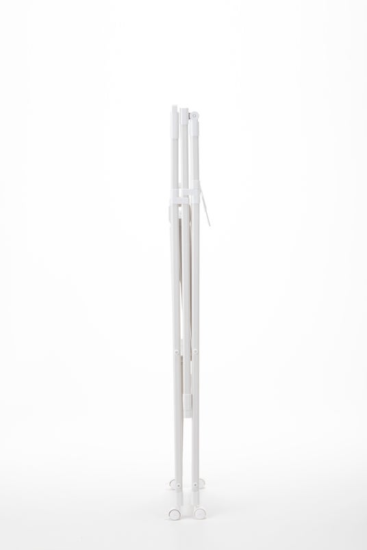 アルミ製で軽く、簡単に幅14cmに折りたためる室内物干し。高さ約153cmでロングコートやワンピースも床につかず干せ、キャスター付きで移動もスムーズ。風通しの良い設計と豊富なタオルバー・ハンガー掛けで、限られたスペースでもたっぷり干せる人気の室内物干しです。