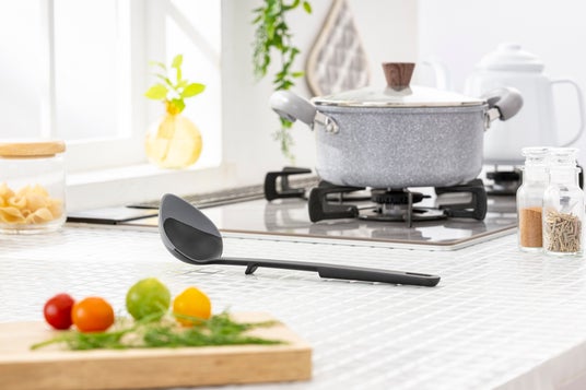 柄の突起によって置いたときに先端が浮く構造で、キッチン台を汚しにくい衛生的なお玉。シリコーン付きの先端が鍋底や側面にフィットし、カレーやシチューの残りもすくいやすい形状。鍋を傷つけにくく、日々の調理と後片付けのストレスを減らしてくれる一品です。