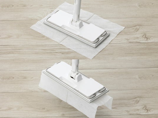 フローリングシートにヘッドを押し付けるだけで貼り付く新構造で、面倒な取り付け作業が不要のフローリングワイパー。本体は自立するため省スペースに収納でき、ワイヤーで挟めば雑巾も取り付け可能です。