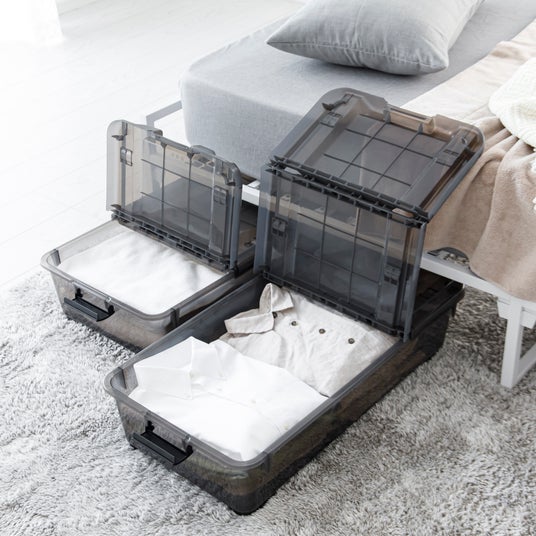 2段階開閉の蓋なのでケースを重ねたままでも開閉ができ、ベッド下やクローゼット下のデッドスペースを有効活用できる浅型収納ケース。クリアブラウンの半透明仕様で中身が程よく目隠しでき、インテリアになじみます。
