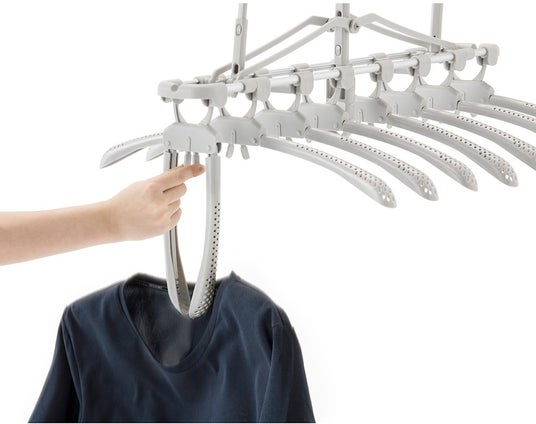 3本のフックで干す時に傾かないだけでなく、竿と竿の間に「渡し干し」もできる、省スペースな8連ハンガー。干し方に重量の偏りがあっても傾きにくく、下から持ちやすい形状で干すのも取り込むのもラク。風通しの良い幅広メッシュ穴ハンガーは衣類が型崩れしにくく、つまみを押すとワンタッチで楽に取り込めるのもポイントです。