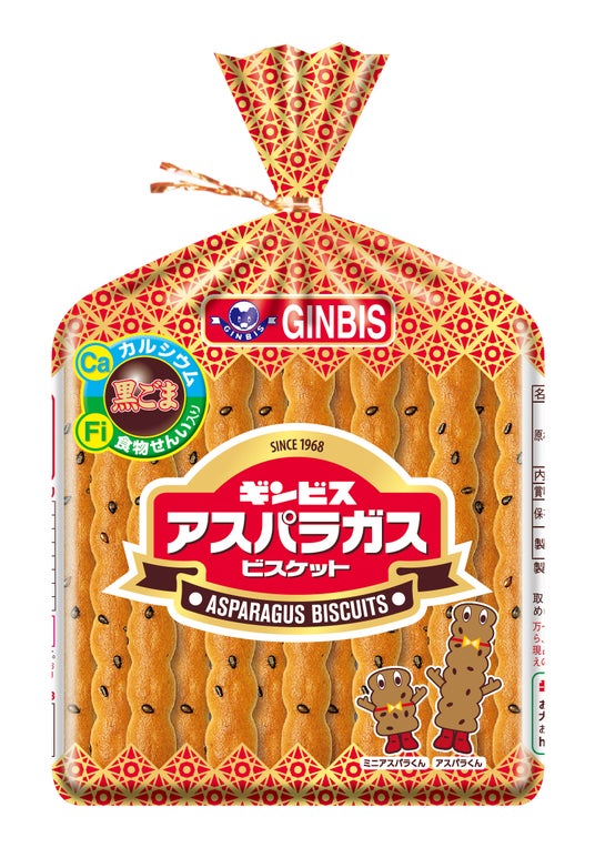 「アスパラガスビスケット」は1968年に発売のビスケット。当時のビスケットといえば、丸形や楕円形、四角の形状が主流だった中、経営方針である『3つのI』のひとつ「Independent(独創性)」の考えのもと革新的なスティック型で発売。発売当初から現在まで巾着のパッケージはデザインがほとんど変わっていません。 素朴な甘じょっぱさが魅力で、からだに優しい食物繊維とカルシウムを配合。8つの節があることが特長で、”外はカリッと、中はサクッと”した食感が楽しめます。