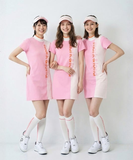 中心となるニットワンピースは、パウダリータッチの柔らかな質感と女性らしいシルエットが特徴で、軽やかで上品な印象を演出します。ゴルフシーンにも調和するスポーティな要素を取り入れながら、華やかさとエレガンスを兼ね備えたデザインに仕上げています。
