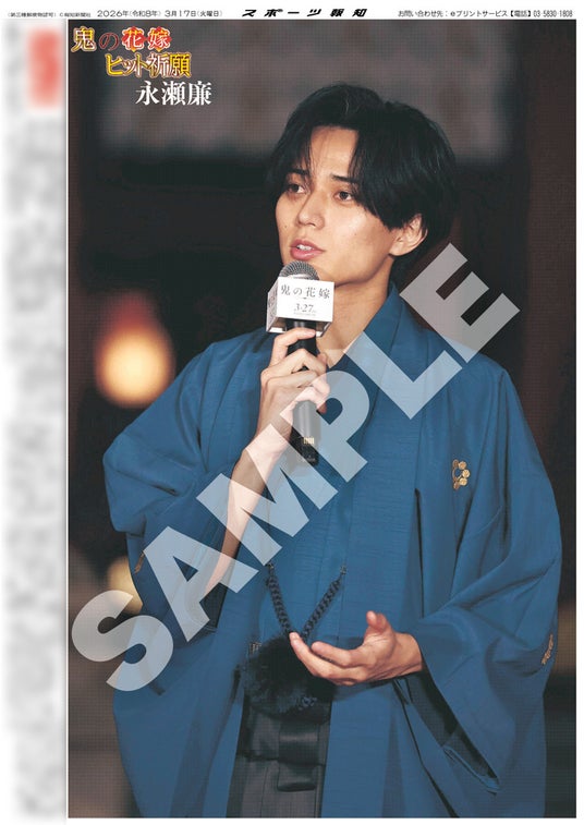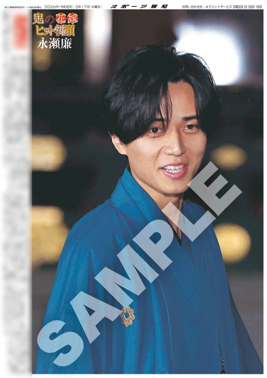 スポーツ報知を発行する報知新聞社(代表取締役社長・長谷川剛)は新聞の一部紙面をコンビニエンスストアのマルチコピー機からプリントできる「スポーツ報知コンビニプリント」サービスを展開中。スポーツ紙ならではの大きな写真を使った紙面をプリント版として販売しています。新たに3月17日付掲載、King&Prince・永瀬廉が女優の吉川愛とダブル主演する映画「鬼の花嫁」の大ヒット祈願イベントの様子を伝える紙面を発売中です。全3種類になります。