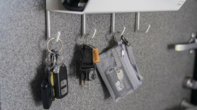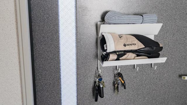 手袋ホルダーの下には、小物を吊るして収納できるフックが4つ付いていました。家や車の鍵はもちろん、折りたたみ傘などのおでかけアイテムをかけておくことができます。
