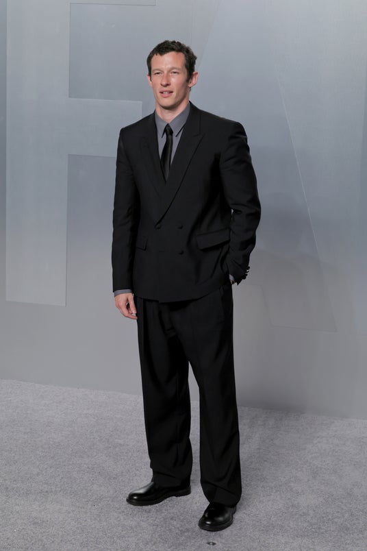 カラム・ターナーは、カスタムメイドのブラックのダブルブレストピークドラペルスーツに、チャコールのシャツ、ブラックのネクタイ、チェルシーブーツをコーディネートしました。