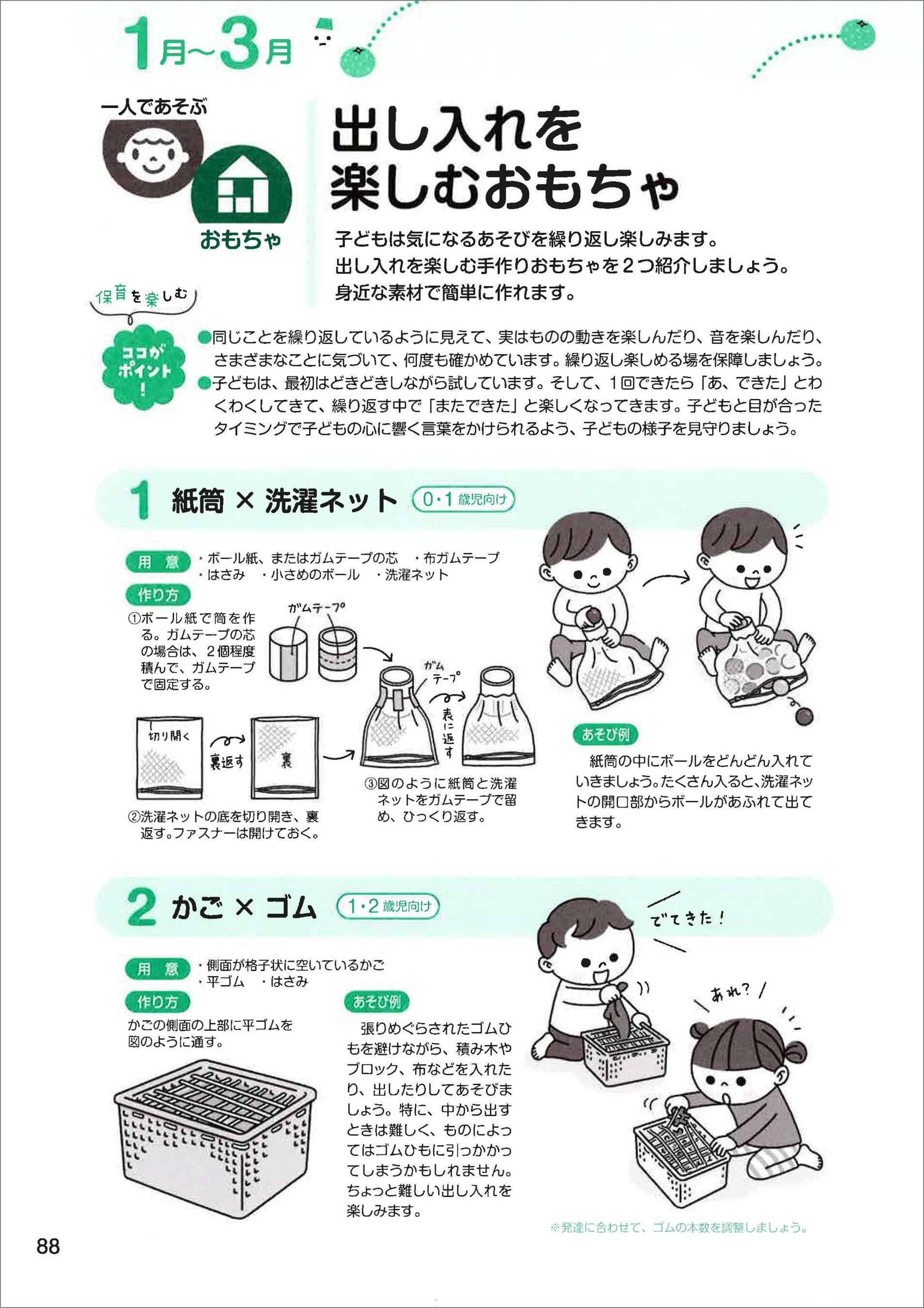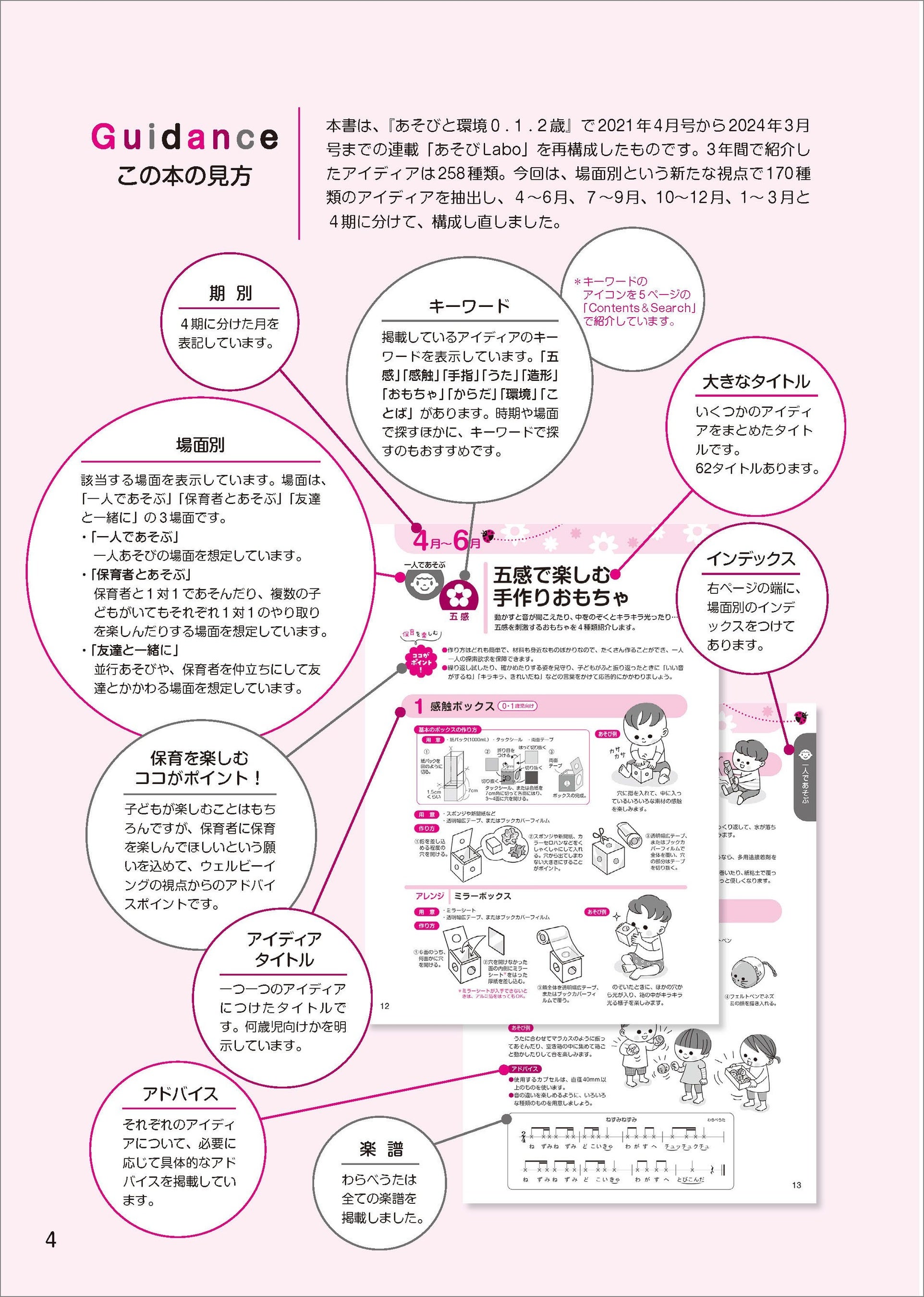 成長著しい0.1.2歳児向けに「一人であそぶ」「保育者とあそぶ」「友達と一緒に」といった、実際の保育現場で想定される3つの「場面」から、今必要なあそびをすぐに選ぶことができます。さらに、4月から翌年3月まで、子どもの発達・興味・関心の流れに沿って構成されているため、子どもの成長段階に合わせた最適なアプローチが可能です。