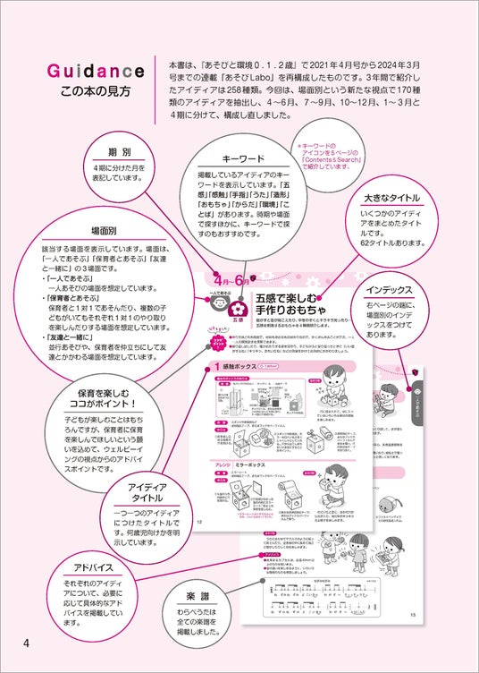 成長著しい0.1.2歳児向けに「一人であそぶ」「保育者とあそぶ」「友達と一緒に」といった、実際の保育現場で想定される3つの「場面」から、今必要なあそびをすぐに選ぶことができます。さらに、4月から翌年3月まで、子どもの発達・興味・関心の流れに沿って構成されているため、子どもの成長段階に合わせた最適なアプローチが可能です。