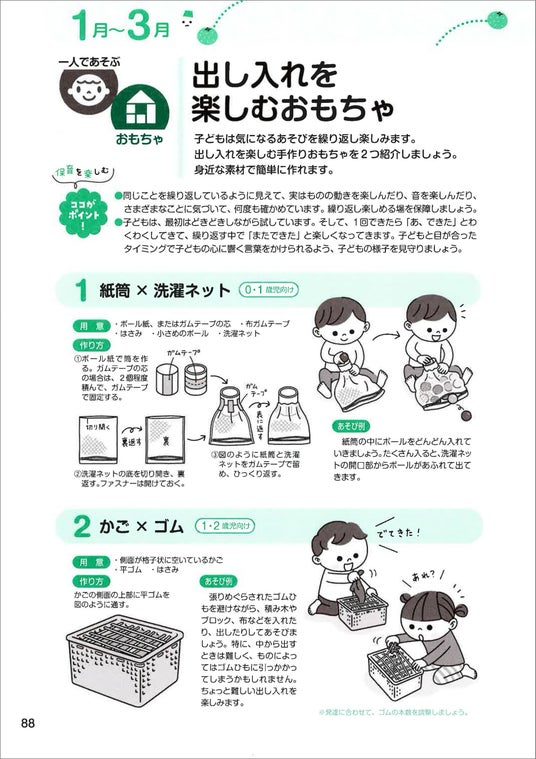 ・出し入れを楽しむおもちゃ 紙筒 × 洗濯ネット/かご × ゴム