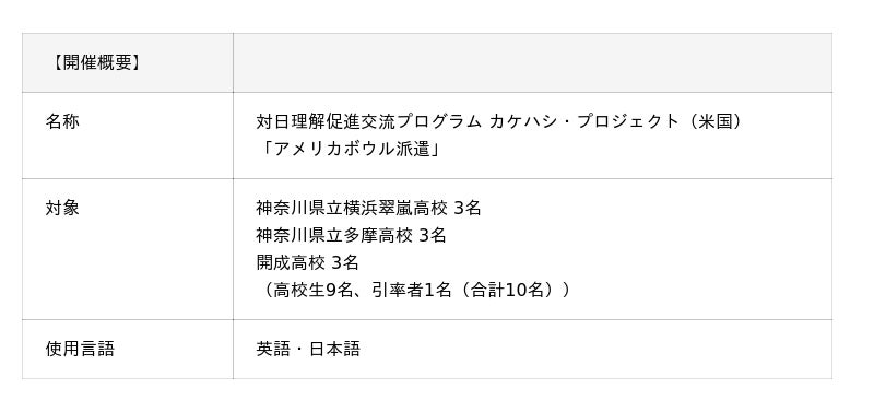 本プログラムは、外務省が推進する国際交流事業「対日理解促進交流プログラム」カケハシ・プロジェクト(米国)の一環で行われる派遣プログラムです。