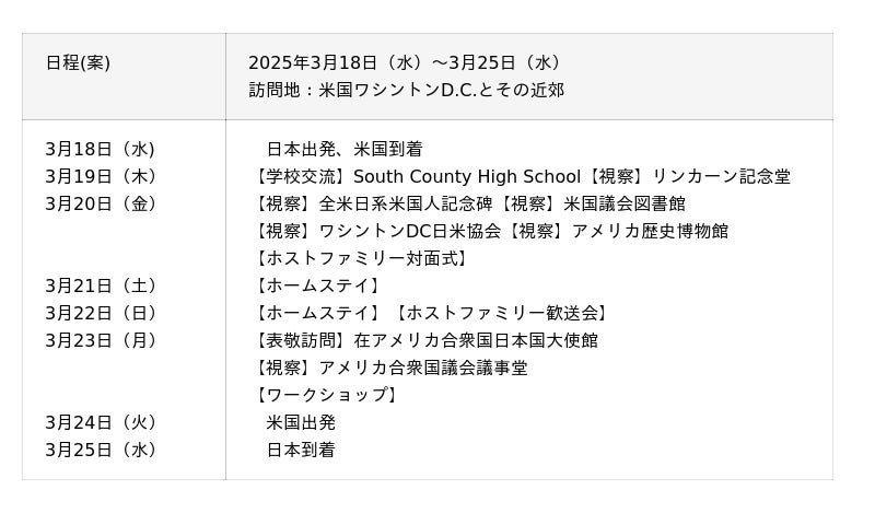 日本の高校生が米国ワシントンD.C.近郊を訪問し、現地の高校生との交流や各視察先での体験を通じて、両国の政治、文化、外交等について理解を深めるとともに、日本の魅力を発信し、友好関係を深めます。