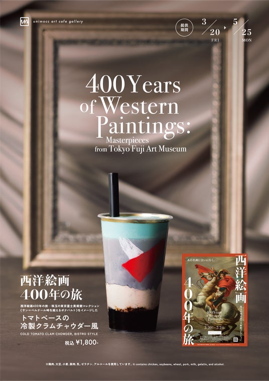 アートカフェunimocc(ユニモック)(株式会社TSUDA CONSTRUCTION COMPANY運営)は、この度、3月20日より京都市京セラ美術館にて開催される『西洋絵画400年の旅―珠⽟の東京富⼠美術館コレクション』(https://www.ktv.jp/event/seiyoukaiga400/)とのタイアップ商品となる『飲む名画』シリーズの新ドリンクを期間限定で販売いたします。