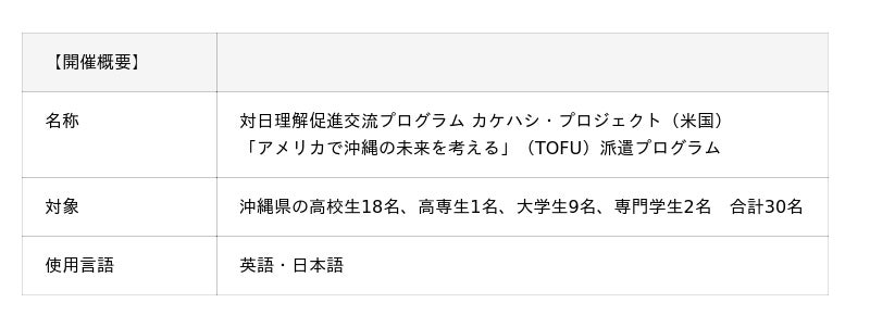 沖縄の学生30名が、カケハシ・プロジェクト「アメリカで沖縄の未来を考える」(TOFU)派遣プログラムを通じて米国を訪問し、日米の友好を深め、国際社会における日本と沖縄の未来やその貢献について考えます。