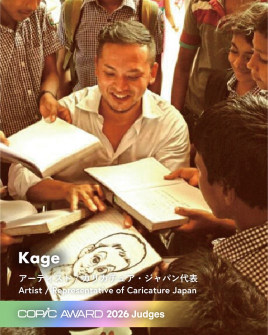 今年の審査員は、「カリカチュア・ジャパン」の代表を務めるKage氏、多岐にわたるジャンルで活躍しているイラストレーターの藤ちょこ氏、デザイナーで東京藝術大学准教授の丸山素直氏、「ブルーピリオド」などで人気の漫画家の山口つばさ氏、鮮やかな色彩と繊細な線描が生む生命感あふれる絵画表現が特徴で、多くのコラボレーションも展開しているアーティストのYuta Okuda氏といった、豪華なクリエイターの方に務めていただきます。審査員を務めていただく5名の方に「審査員としての意気込み、応募を予定している方へのメッセージ」を頂戴しましたので紹介いたします。審査員によるミニインタビュー全文は、コピックアワード公式サイトでご覧いただけます。