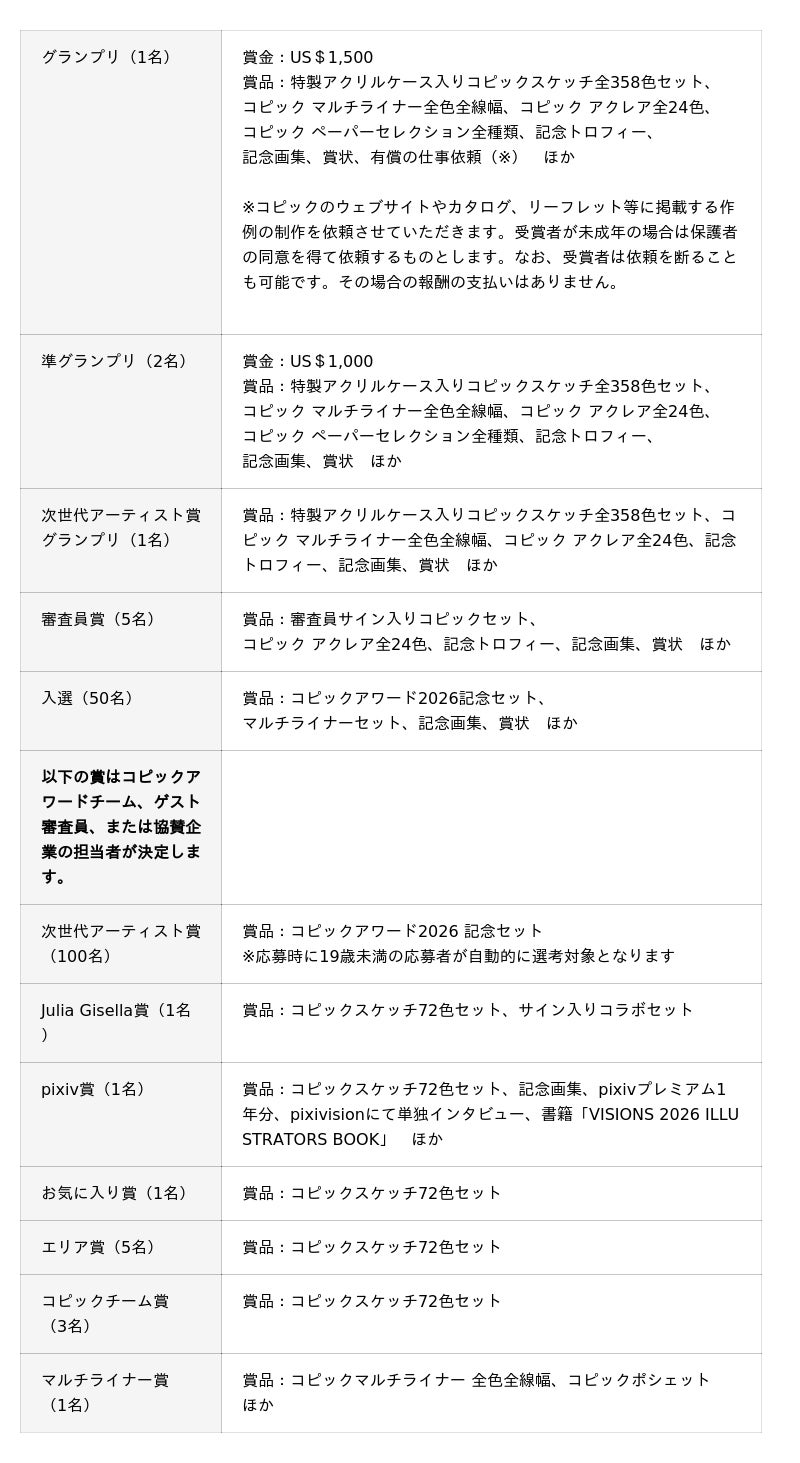 クリエイターのためのSNS「pixiv」を運営するピクシブ株式会社協賛の「pixiv賞」受賞者にはpixivプレミアム1年分、pixivisionにて単独インタビュー、書籍「VISIONS 2026 ILLUSTRATORS BOOK」といった豪華な賞品が贈られます。