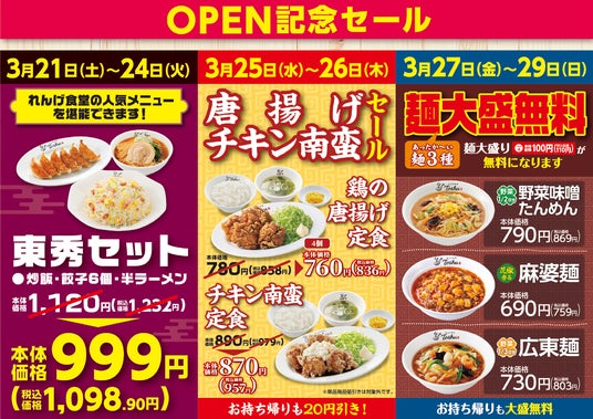 当店では、3月21日(土)から期間限定で、人気メニューがおトクに楽しめるオープン記念セールを実施します。