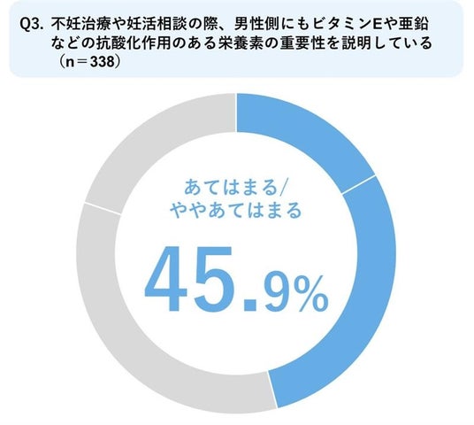 - 一方で、「不妊治療や妊活相談の際、男性側にもビタミンEや亜鉛などの抗酸化作用のある栄養素の重要性を説明している」と答えた医師は45.9%となりました。