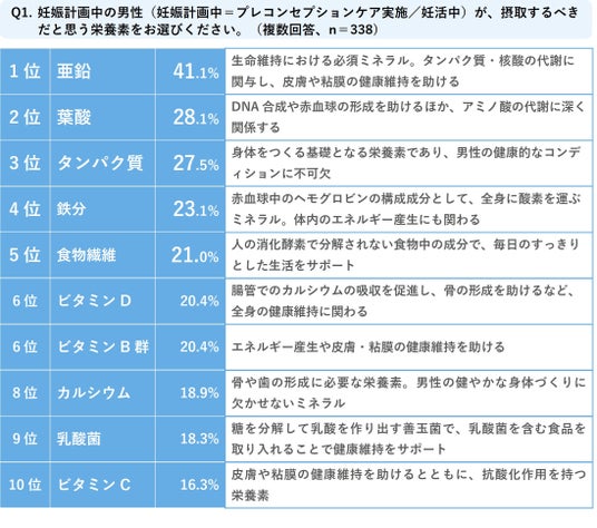 - 「妊活中の男性が摂取するべきだと思う栄養素」について、今回調査を行った産婦人科医の、4割超が「亜鉛」と回答。男性の健康的な身体づくりに深くかかわる「亜鉛」を摂取することの重要性が明らかに。