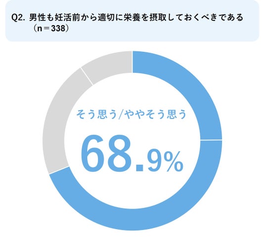 - 医師の68.9%が「男性も妊活前から適切に栄養を摂取しておくべき」という質問に対して「そう思う」と回答。約7割の産婦人科医が、健やかな妊娠に向けたコンディショニングのためにも男性の妊活前からの栄養摂取を重要視しているという結果に。
