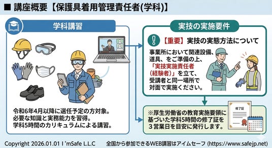アイムセーフ合同会社では、厚生労働省通達による【保護具着用管理責任者】を社内受講できる便利なオンライン講習会で実施しています。
