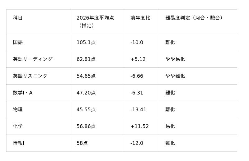 2026年度大学入学共通テストは、主要科目の難化により平均点が大きく下落したことが大きな特徴です。
