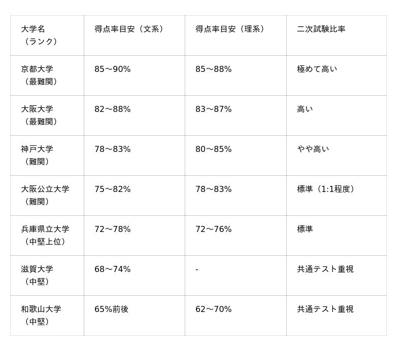 一方、和歌山大学や兵庫県立大学では共通テストの比重が比較的高く、共通テストでの得点が合格可能性に直結する傾向があります。