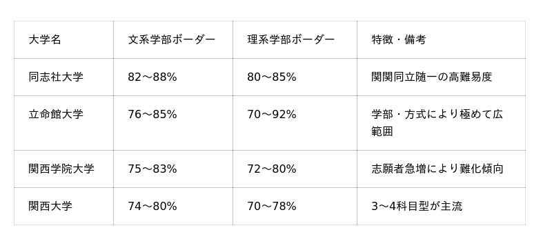 特に同志社大学は文系82~88%、理系80~85%と最も高難易度で、立命館大学は学部により70~92%と極めて幅広くなっています。