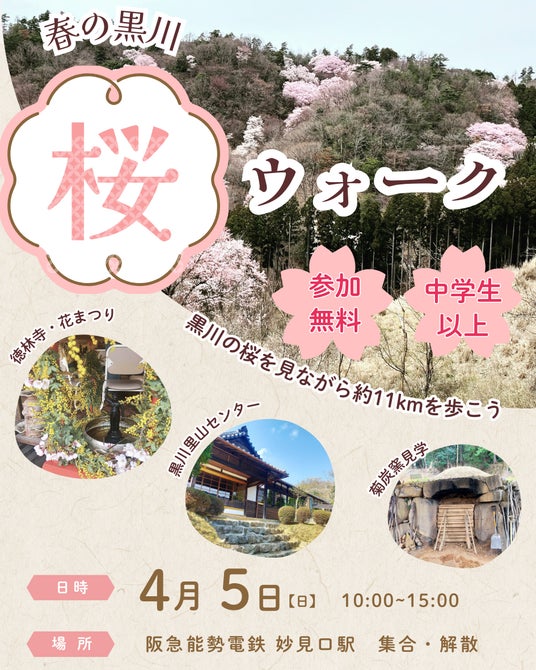 イベントでは、妙見口駅(大阪府豊能町)をスタートし、旧ケーブル線沿いの桜、徳林寺、黒川・桜の森、黒川里山センター、菊炭窯を巡る約11kmのコースを歩きます。