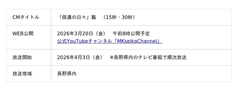 エムケー精工株式会社(本社:長野県千曲市、代表取締役:丸山将一)は、2026年3月20日(金)より、新CM「信濃の日々」篇を公式YouTubeチャンネル「MKseikoChannel」にて公開します。2026年4月3日(金)からは、長野県内のテレビ番組で順次放送予定です。