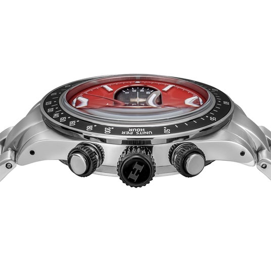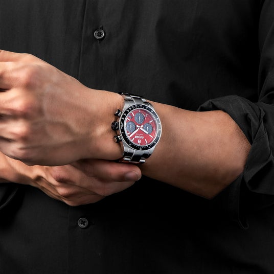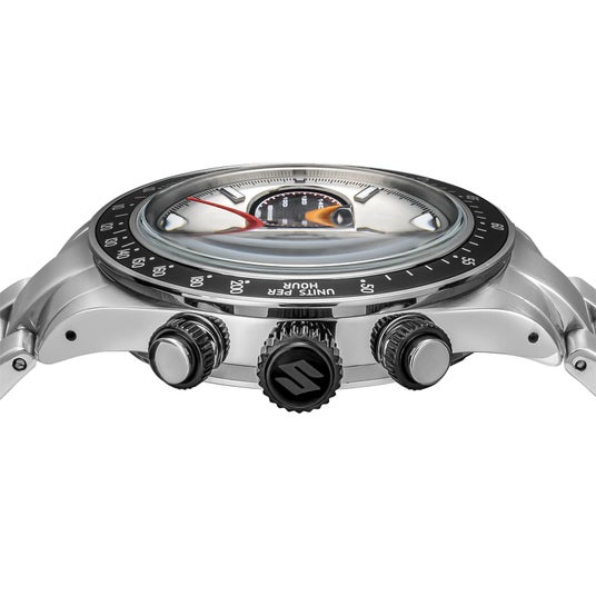 リューズとプッシュボタンはタイヤとホイールをイメージしたツートンカラーを採用。ブラッ