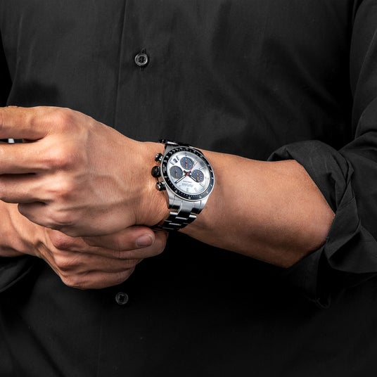 クとシルバーのコントラストにより、メカニカルで精悍な印象を腕元に与えてくれる。
