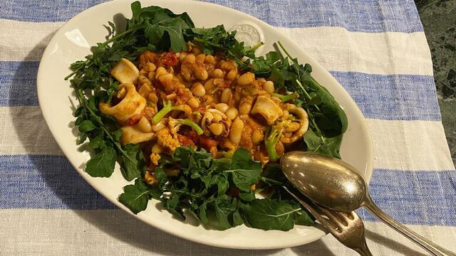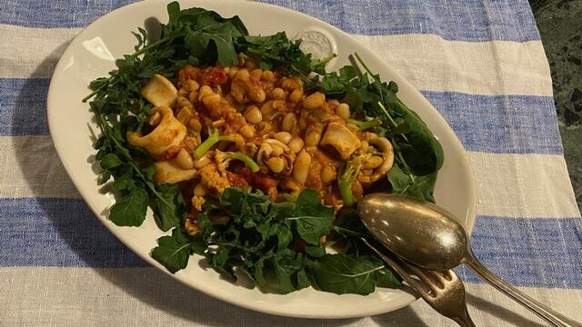 茹でて冷凍保存してあった白インゲン豆とヤリイカとニンニク、玉ねぎ、ミニトマト、トマトペーストを炒め煮。これがうまい。白インゲン豆、なかなかやるなあ。ルコラと一緒に食べる。