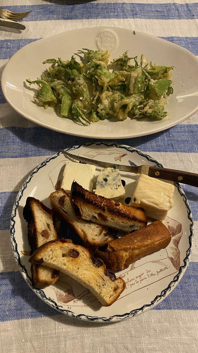 プンタレッレのフリット、レーズンパンとチーズ(Kiri、タレッジオ、ダナブルー)。これだけでお腹いっぱいになってしまい、予定していたリゾットは明日に持ち越す。