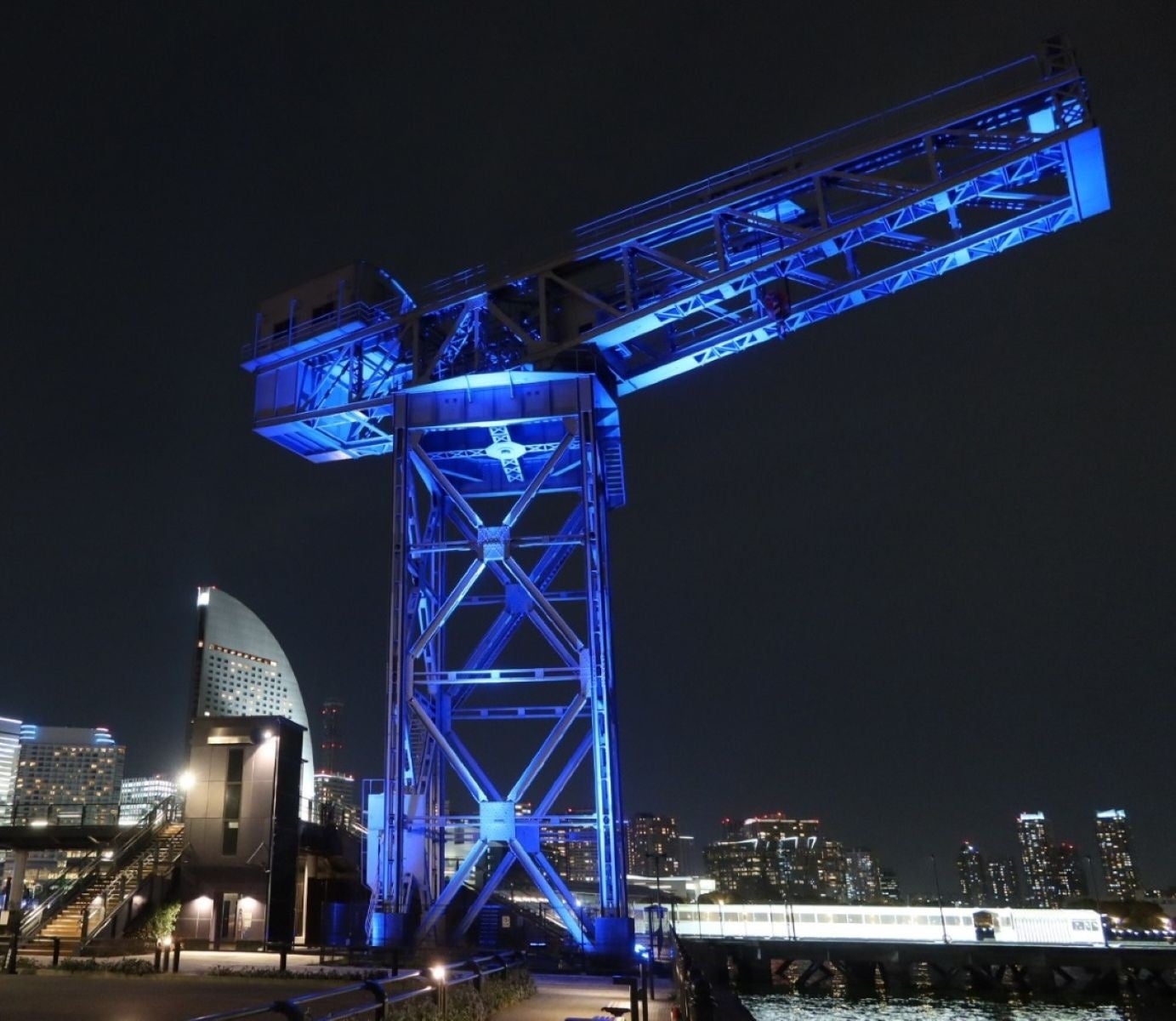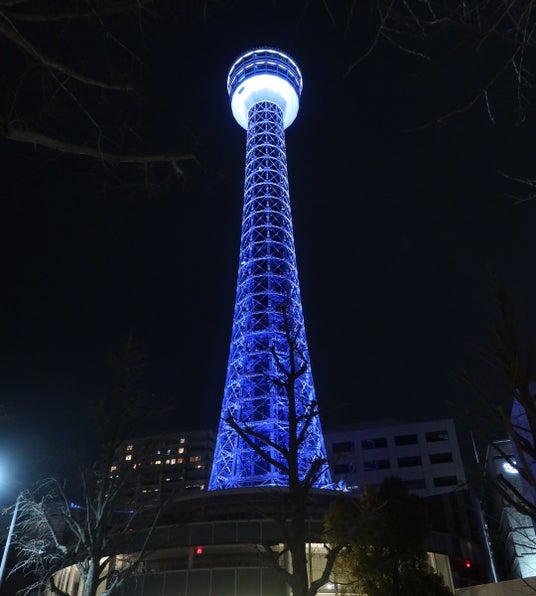世界自閉症啓発デーのシンボルカラーである「癒し」「希望」「平穏」を表す青色の光で、市内の観光スポット等をライトアップします。今年は、新たに横浜市風力発電所「ハマウィング」が加わり、青い光で理解の輪を広げます。昨年度のライトアップの様子