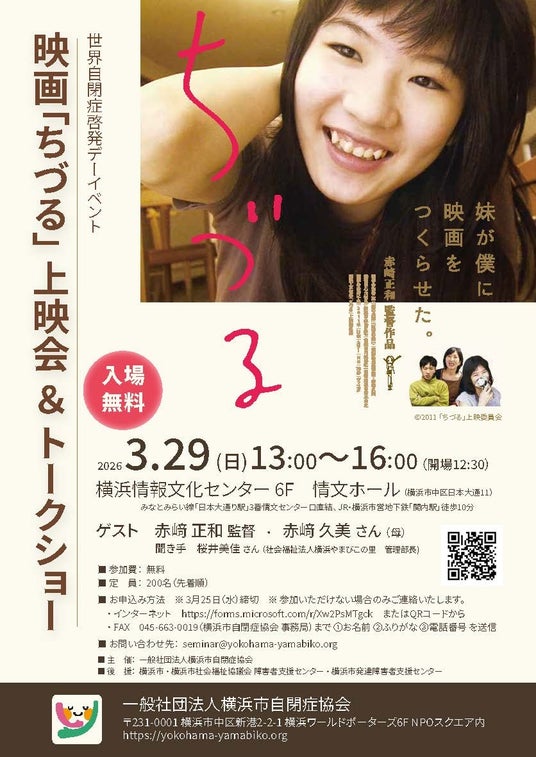 自閉スペクトラム症の女性・ちづるさんとその家族の日常を丁寧に描いたドキュメンタリー映画『ちづる』の上映会を開催します。上映後には、監督であるお兄様とお母様をお迎えし、映画制作当時から現在に至るまでの生活や思いを語っていただきます。【日時】令和8年3月29日(日)13:00~16:00(開場12:30)