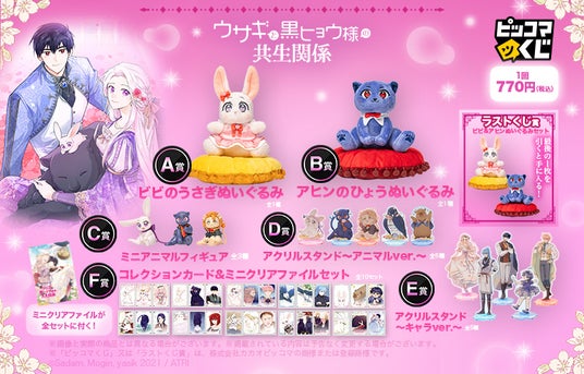 A・B賞には、抱きしめたくなるビビとアヒンのぬいぐるみが登場。C賞のミニアニマルフィギュアやD賞のアクリルスタンド~アニマルver.~など、作中の可愛らしい姿を再現したアイテムをラインアップしました。ビビたちの“もふもふ”な魅力と二人の絆を感じられるコレクションです。ラストくじ賞のぬいぐるみセットまで作品の優しい世界観を詰め込んでいます。・作品名:ウサギと黒ヒョウ様の共生関係