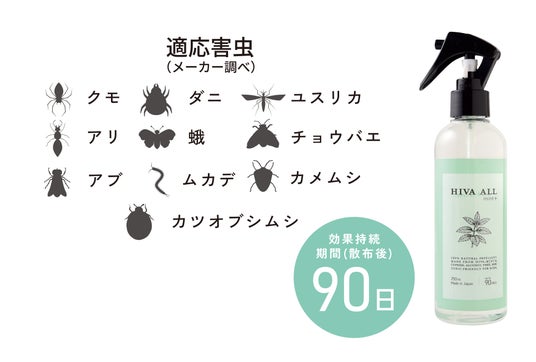 【HIVA ALL ミント+ - ヒバオール ミントプラス-】は殺虫成分、アルコール、有機溶剤を一切使用せず、ヒバやヒノキから抽出したヒノキチオールなど天然由来成分を100% 配合した害虫忌避スプレーです。 虫を殺さずに「忌避する」ことで、ご家庭の衛生環境を安全かつ快適に保ちます。従来の「ヒバオール」の優れた害虫忌避効果はそのままに、新たに「ハッカ油」をプラスし、清涼感をより感じられる仕様へと進化しました。
