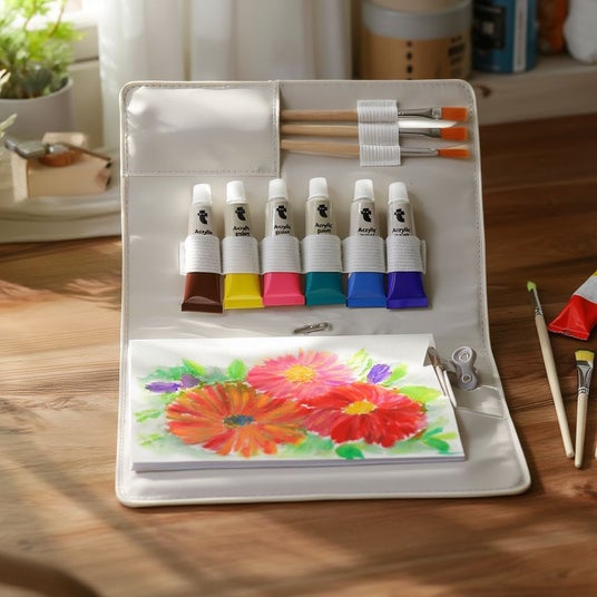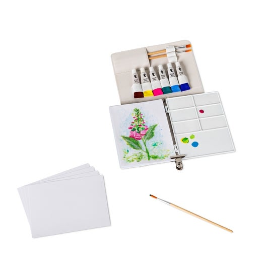 筆とアクリル絵の具、用紙、パレットがすべてセットになったオールインワン。旅先で見た風景を、気軽に描くことができます。