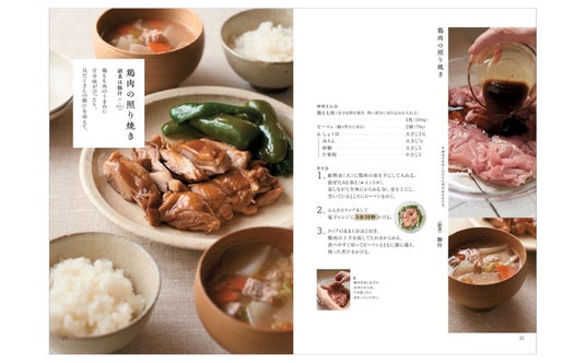 “鶏肉の照り焼き”と“豚汁”など、たんぱく質と野菜をたっぷり摂取できる献立の組み合わせもご紹介。また、2~3日は保存ができる常備菜のアレンジレシピなどで、ごはん作りのレパートリーが無理なく増えます。電子レンジなら、火を使わないから安心して作れるのが魅力。材料を入れたら電子レンジにおまかせで美味しい料理が毎日作れます。