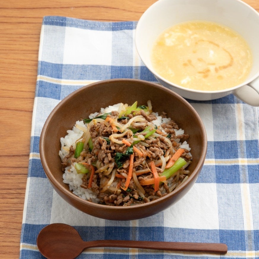 肉と野菜がとれる主役ごはんとやさしい甘さの鶏だしスープ! ビビンバ風ごはんの献立