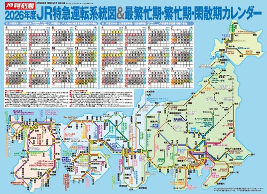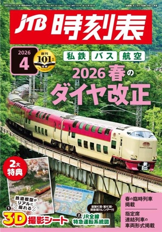 JTBグループで旅行・ライフスタイル情報を提供する株式会社JTBパブリッシング(東京都江東区、代表取締役 社長執行役員:盛崎宏行)は、『JTB時刻表』 2026年4月号を2026年3月19日(木)に発売します。本号では、春の私鉄やバスのダイヤ改正情報を掲載するとともに、付録として表面が「鉄道模型がリアルに撮れる!3D撮影シート」、裏面に「JR特急運転系統図&繁忙期・閑散期カレンダー」を掲載しました。