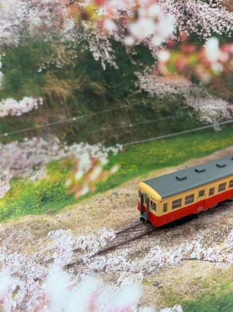 背景や地面の質感を立体的に再現し 、車両を置くだけで自然な情景が広がるのが特徴です。桜の木々が手前に飛び出して見えるため、模型が本当に桜の下を通過しているような不思議な臨場感を味わえます。スマートフォン撮影でも奥行きが強調され、模型のディテールが際立つリアルで迫力ある写真表現が可能です。