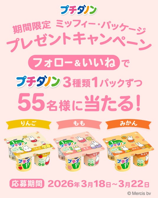新たなプチダノンとミッフィーのコラボレーションを記念し、本日3月18日(水)より、ベビーダノン・プチダノンの公式Instagramアカウントにてプレゼントキャンペーンを実施します。公式アカウントをフォローし、対象投稿に「いいね」していただいた人の中から、抽選で55名様にミッフィーコラボパッケージのプチダノン詰め合わせ(りんご・もも・みかんの3製品)をプレゼントします。