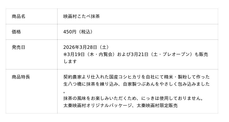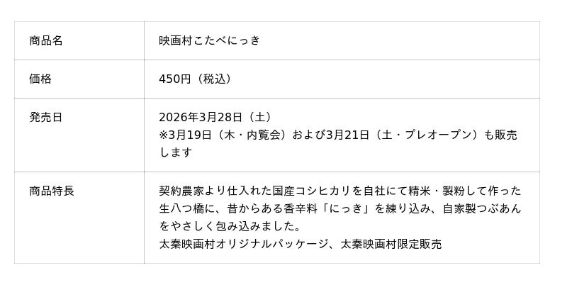 京都銘菓「つぶあん入り生八つ橋 おたべ」や「京ばあむ」などを製造・販売する株式会社美十(本社:京都府京都市、代表取締役社長CEO:酒井宏彰、以下「美十」)は、2026年3月28日(土)に控える太秦映画村の第1期リニューアルオープンを記念し、太秦映画村オリジナルパッケージの「映画村こたべにっき」および「映画村こたべ抹茶」を同施設にて限定販売します。2026年3月28日(土)の発売に先駆け、内覧会である3月19日(木)およびプレオープンの3月21日(土)に先行販売します。