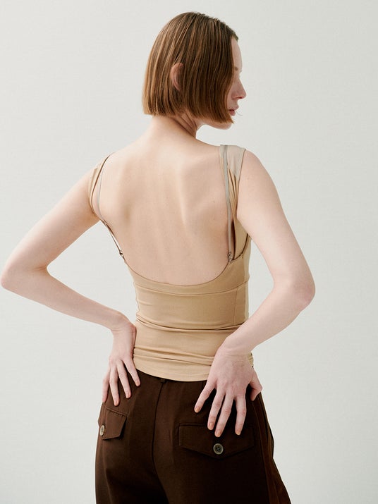 背中を大きく開けたデザインが特長の、カップ付きタンクトップインナー。