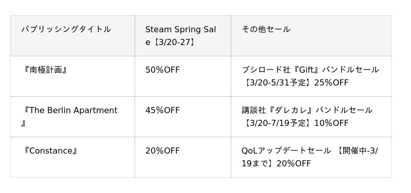 3月20日(金祝)から始まる『Steam Spring Sale』への全タイトル参加に加え、サバイバルアドベンチャー『南極計画』では待望のセーブ機能を含む大型アップデートV1.2を配信。2Dアクションアドベンチャー『Constance』はMy Nintendo Store および PlayStation(R)Storeでの販売を新たに開始し、QoLアップデートも配信中です。2D探索アドベンチャー『The Berlin Apartment』は講談社のパブリッシングタイトル『ダレカレ』、『南極計画』はブシロード社のパブリッシングタイトル『Gift』と、それぞれバンドルセールの開催も決定しました。
